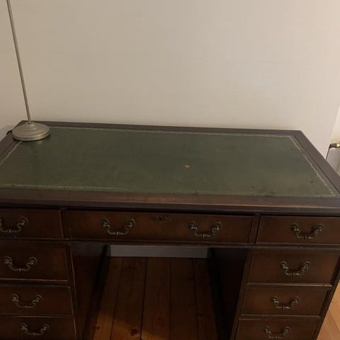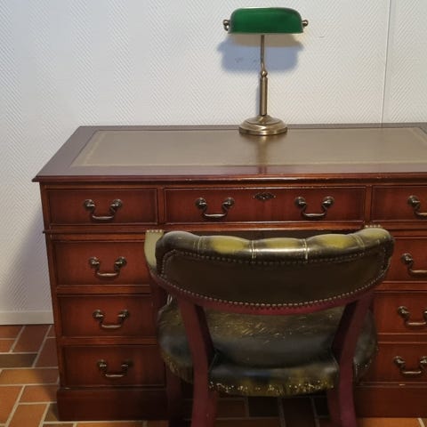 Vintage engelskt skrivbord med stol. Idegran, mässing och läder. Fint skick och nyckel finns. England, vintage, skrivbord, Chesterfield, bibliotek.