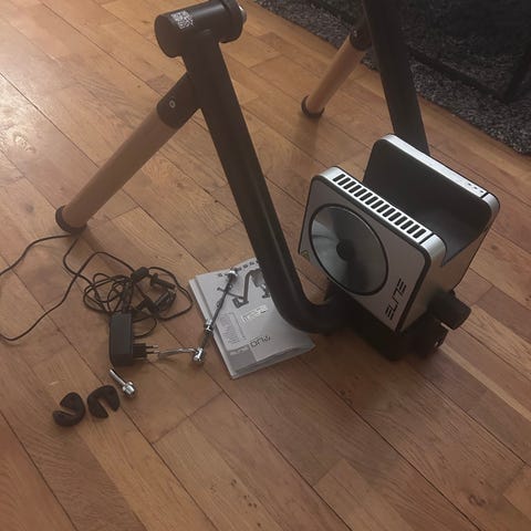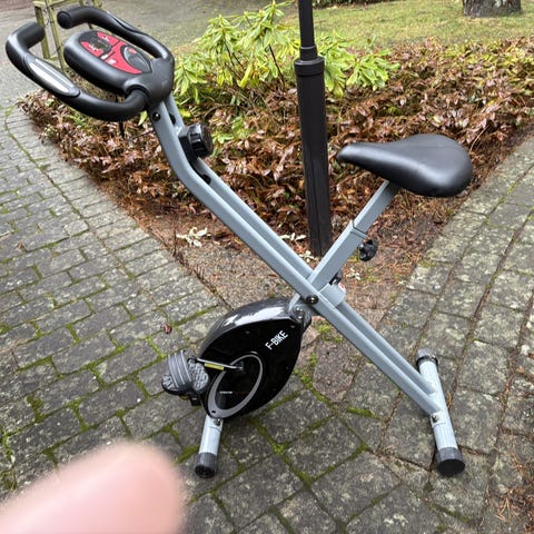 Ultrasport F-Bike träningscykel i vit färg. Utrustad med digital display som visar hastighet, distans, tid, kaloriförbrukning och puls. Kompakt och hopfällbar design för enkel förvaring och användning inomhus.