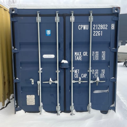 Blå fraktcontainer med storleken 40 fot. Använd endast för lager och har inte använts för sjötransporter.