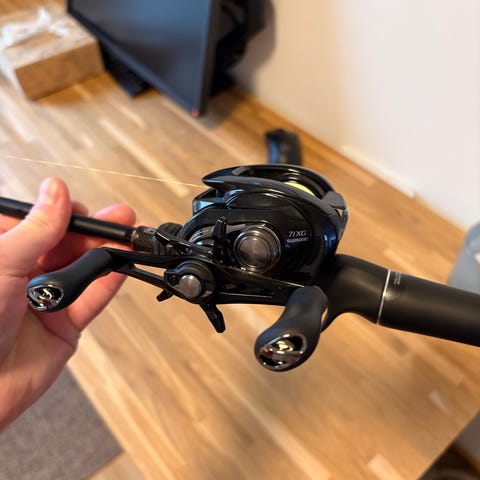 Två Fiskespön med rullar, beten, håv och tillbehör.