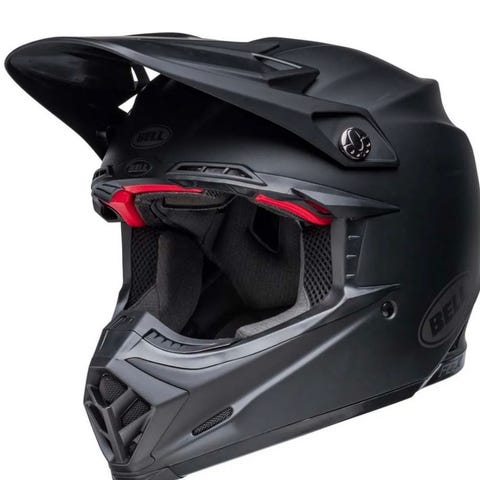 Crosshjälm F-X4, svart i storlek L60. Röd inredning och utrustad med ventilationsöppningar. CE-certifierad enligt ECER22-05 standard.