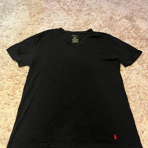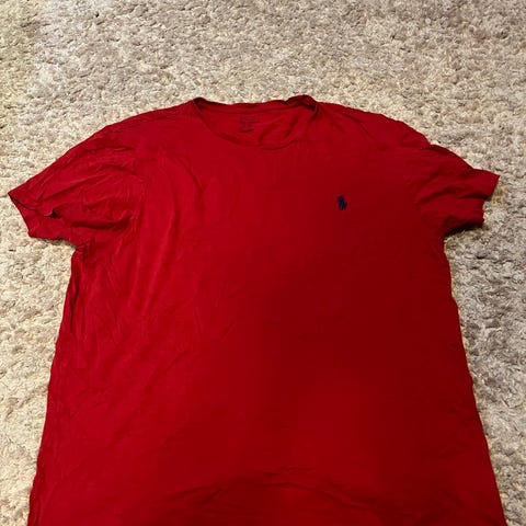 Polo Ralph Lauren T-shirt i mörkblå färg, storlek M, tillverkad av 100% bomull. Passar herrar och har en klassisk rund halsringning. Produkten är märkt med Polo Ralph Laurens logotyp i rött på bröstet.