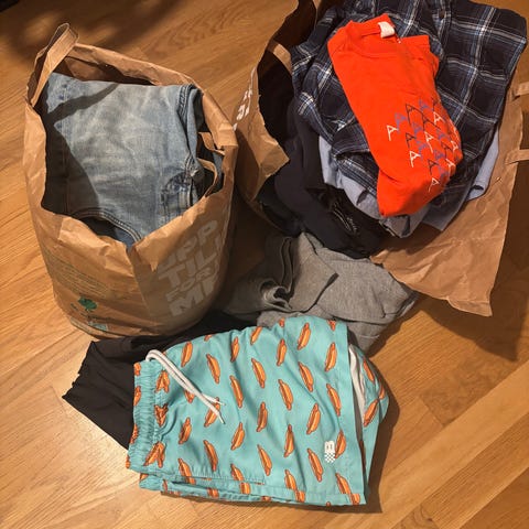 Olika plagg, shorts, byxor, jackor, kort/långärmade tröjor och skjortor.