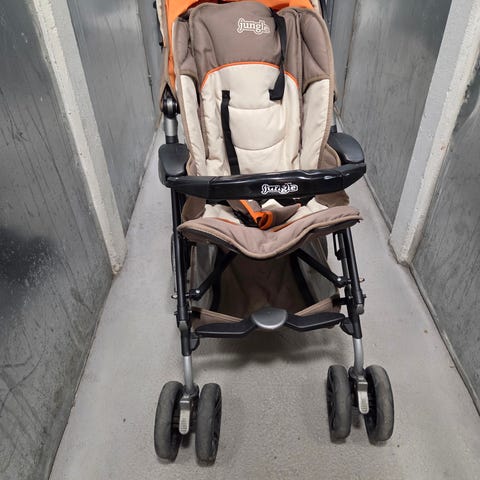 Emmaljunga barnvagn med röd och svart klädsel. Barnvagnen har en robust ram och fyra hjul, med förvaringskorg under sitsen. Passar för barn och är utformad för utomhusbruk.