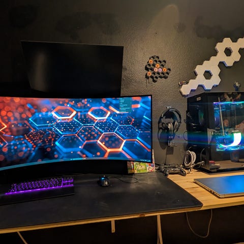 HP stationär dator med svart chassi. Inkluderar tillbehör som mekaniskt tangentbord med RGB-belysning, optisk spelmus med belysning och mikrofon på justerbar arm. Passar för allmän datoranvändning och spel.