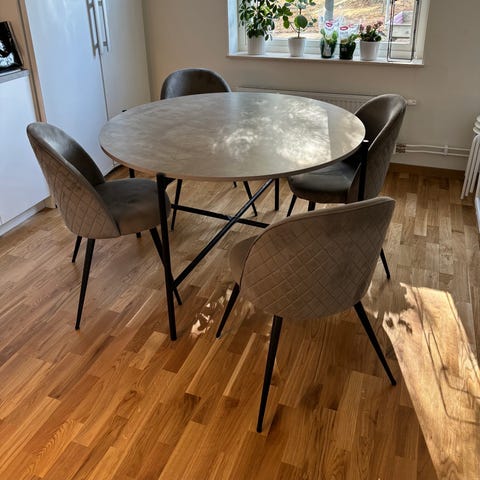 Matbord med klaffar på bägge sidor från IKEA i fint skick. Finns en liten låda med miniförvaring. Båda stolarna i mycket fint skick ingår.