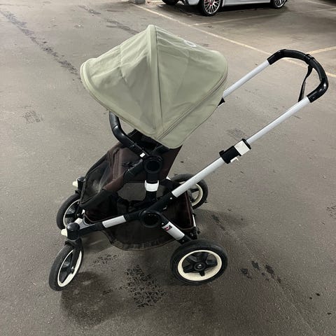 Bugaboo barnvagn med tre suffletter i svart och beige, samt förvaringskorg under sittdelen. Ingår även liggdel. Fungerar bra, men i använt skick.