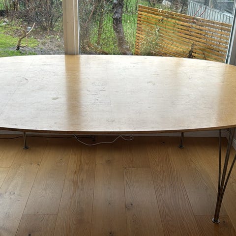 Säljer ett vitt ovalt matsalsbord med två tillhörande iläggsskivor. Matbordet liknar bordet superellips av Bruno Mathsson till designen. Okänt märke.