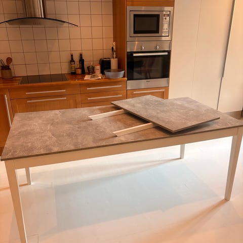 Det finns några märken och små skrapmärken på bordet yta. Några fästen för iläggsskivorna sitter löst, men det påverkar inte användningen av bordet som fungerar fint med iläggsskivor.
