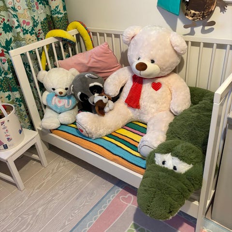 Allt är köpt nytt förutom det mintgröna lakanet med vita moln.