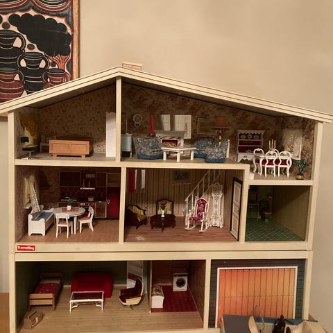 Dockhus i trä med flera rum och möbler inklusive köksutrustning, sovrumsmöbler, leksaker och sittplatser. Inredningen består av detaljerade tapeter och olika möbler som bord, stolar, sängar, piano och andra tillbehör. Passar som leksak eller samlarobjekt.