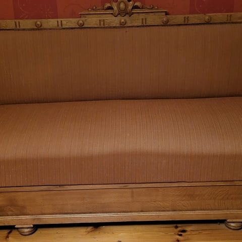 Charmig äldre träsoffa i fint skick med bra sittkomfort. Smart förvaring under locket och möjlighet att dra ut soffan till en bädd. Utfälld mäter ca 54 × 100 cm. Enkel att klä om – perfekt för dig som vill sätta din egen stil.