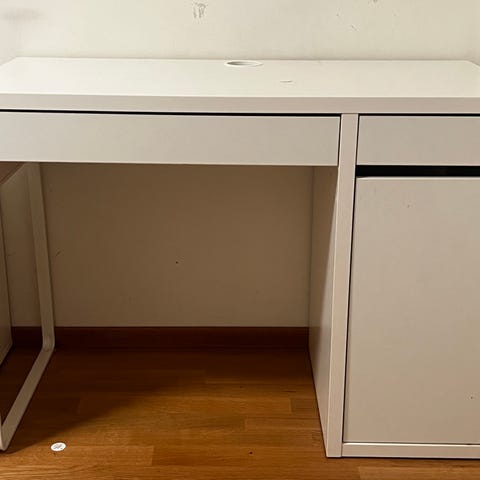 IKEA skrivbord med bordsskiva i glas och ram i svart metall. Skrivbordet har ett fack för förvaring och en.