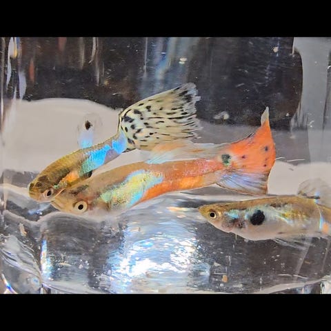 5 st galaxy guppy hanar och en mutation hane (udda färgad från samma grupp) söker nytt hem. Älskar att dansa för sina honor och mycket fart. Skimrar fint! Finns även en okänd grå hona och ett gäng mix yngel.