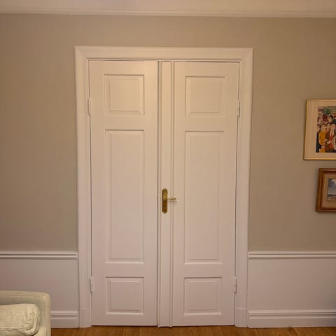 Dubbel innerdörrar i trä, med glasrutor med spröjs. Dörrarna är målade i vitt och har klassisk design med paneler och glasdelar. Passar som rumsskiljare eller tillgång till andra rum i bostad.