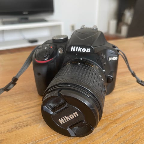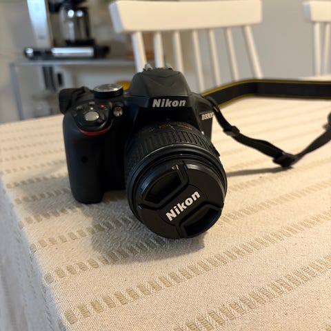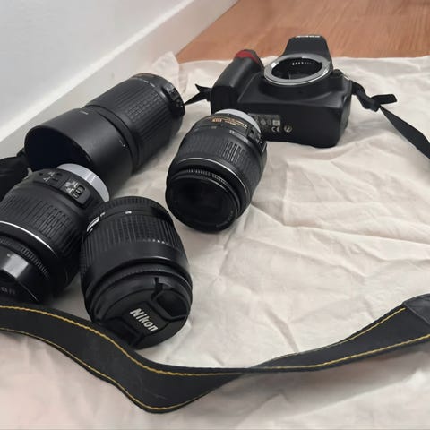 Nikon Digital systemkamera. Kameran är digital och av märket Nikon. Produkten inkluderar olika tillbehör såsom kameraväska och andra tillbehör som syns på bilderna.