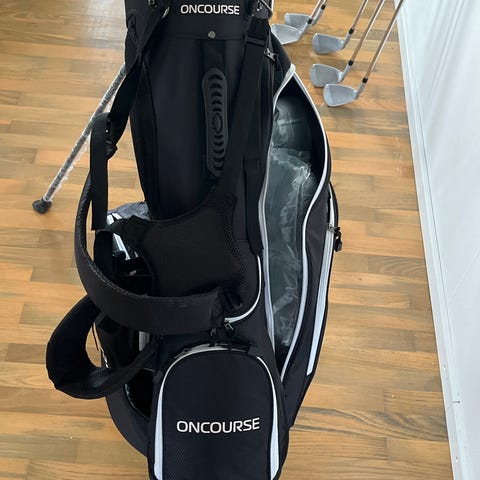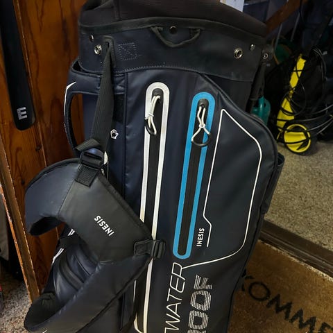Motocaddy Dry-Series golfbag i svart och blå färg. Golfbagen har flera fack för förvaring och ett organiserat klubbutrymme med delare för att hålla klubbor separerade och skyddade.