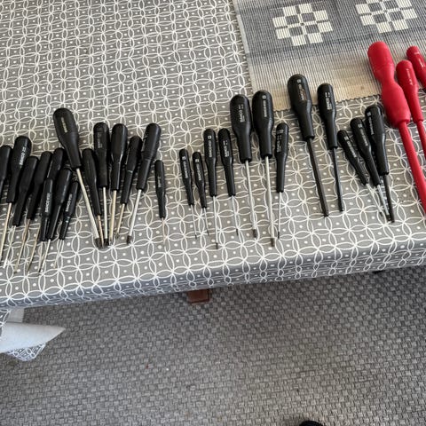 Mejselsats med handtag i rött och orange, inklusive olika storlekar av mejslar med metallblad och plasthandtag. Verktygen är avsedda för handarbete och kan användas för olika typer av mejslings- och skruvuppgifter.