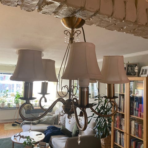 Taklampa/ljuskrona i antikvit färg och Shabby chic stil. Köpt på My white countryhouse för ca 900 kr.