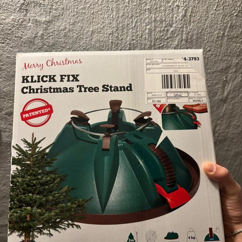 Klick Fix Christmas Tree Stand julgransfot med justerbara klämmor för att hålla granen stadigt på plats. Tillverkad i plast med en vattenbehållare för att hålla granen fuktig. Enkel att använda för att montera och justera granen vertikalt och stabilt.