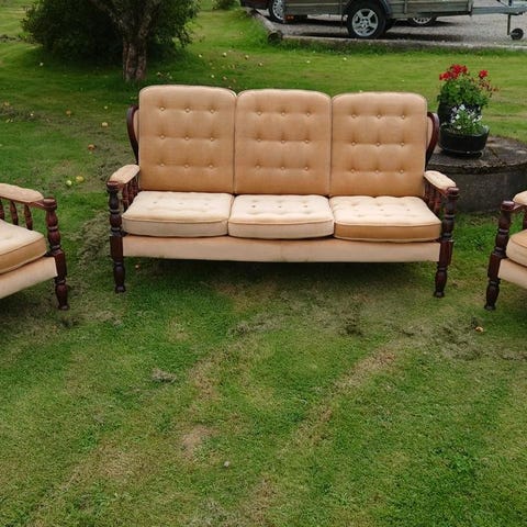 Soffgrupp med bord, stolar, fåtöljer & sidobord - bonad björk, 1900-talets mitt.