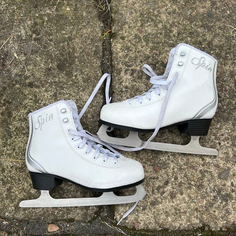 Spin barnskridskor i storlek 32 med vit färg. Skridskorna är avsedda för övriga skridskosporter och är utformade för barn. Sparsamt använda i gott skick.