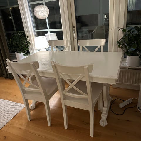 Matbord samt 6 stycken stolar skänkes mot avhämtning. Okej skick, finns vissa fläckar på bord samt stolar.