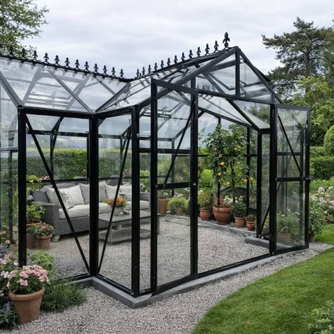 Växthusmodell Ålesund är ett kompakt, stabilt och stilrent växthus i svartlackerad aluminium, utviklet for nordisk klima. Med en odlingsyta på 7,9 m², kombinasjon av 4 mm härdat säkerhetsglas i väggarna og 6 mm UV-beständigt polykarbonattak, får du et drivhus som gir gode vekstforhold, høy slitestyrke og enkel montering – perfekt for hageentusiaster med begrenset plass.