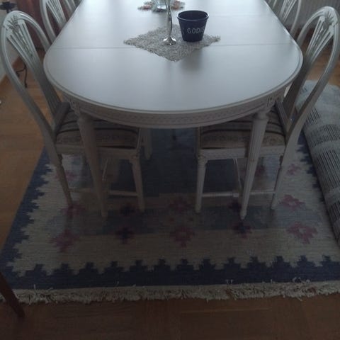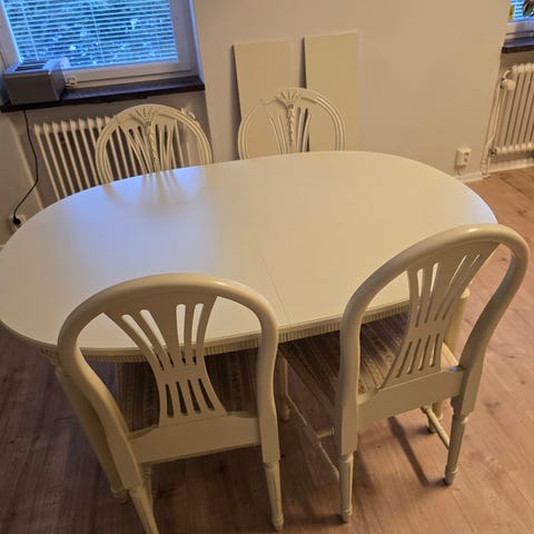 Säljer ett matchande set i gustaviansk stil bestående av runt matbord med 2 iläggsskivor, 4 stolar samt skänk/sideboard.