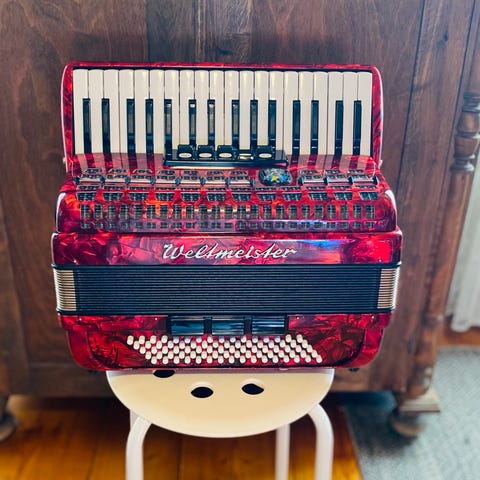Välkommen och prova bland annat detta dragspel ur sortimentet i butiken och verkstan.