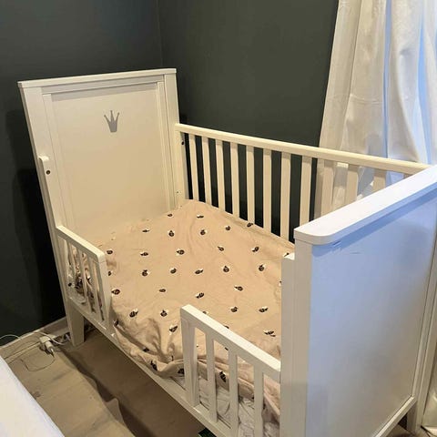 Troll Royal spjälsäng plus juniorsida och madrass. Madrassen är jättefin . Sängbottnen kan justeras i tre olika höjder.