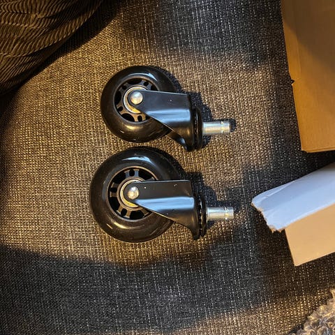 5 st helt nya hjul till skrivbordsstolen i sin originalförpackning. Tappen är gängad M8 och 13 mm hög. Hjulen är svarta och 48 mm i diameter.