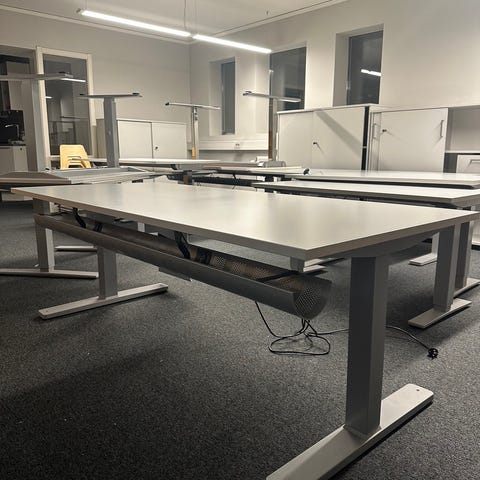 Skrivbord i trä med flera lådor för förvaring. Bordets yta och lådor visar viss användning. Passar för kontors- eller hemmiljö.