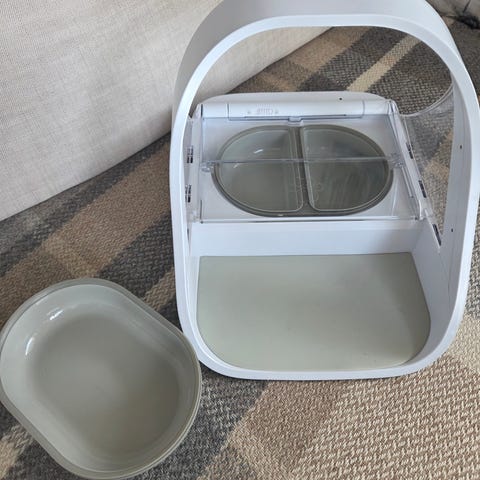 Automatisk matdispenser för husdjur i vit färg. Enheten har en behållare för mat och en skål för utfodring. Passar för att automatisera matning av husdjur. Med kamera.