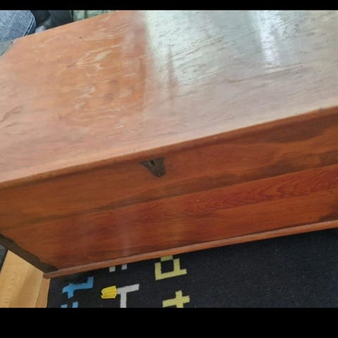 Sängskista i trä. Lådan har en enkel design med en vitmålad yta och är försedd med ett lås och gångjärn för öppning. Passar för förvaring av olika föremål i hemmet.