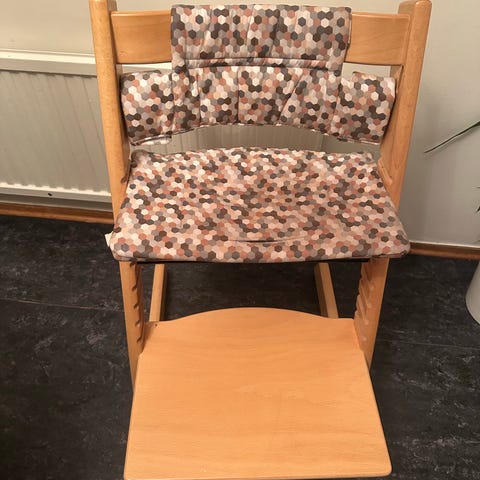 Stokke barnstol, målad röd. Justerbar sitt- och fotplatta för anpassning efter barnets storlek. Stabil konstruktion av trämaterial.