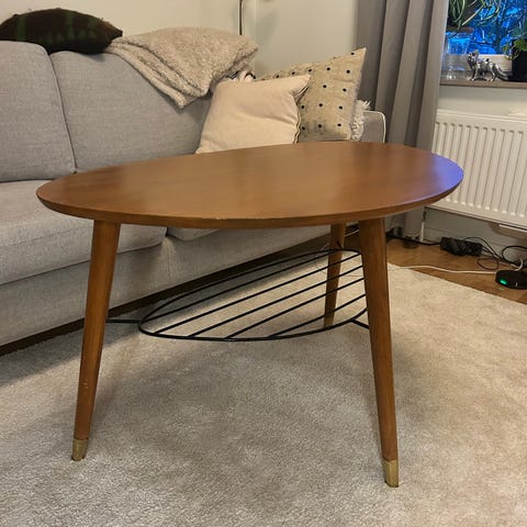 Soffbord från 70-talet med behandlat trä och smal mässingsprofil längs med kanten. Lättskött, kan torkas av med fuktig trasa.