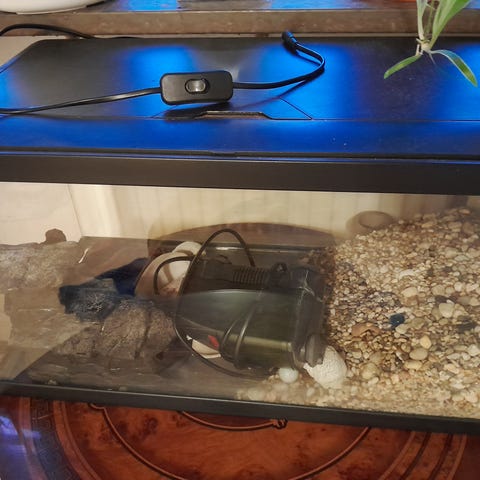 Skänker bort ett akvarium med tillbehör. Akvariet har en spricka i ena hörnet på glaset, vilket syns på bilderna. Inget som påverkar funktionen.