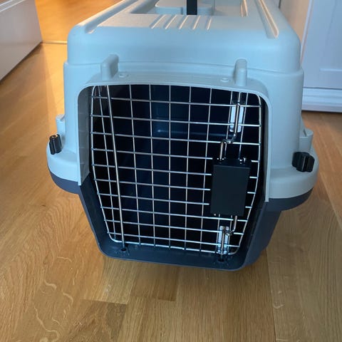 Transportbur för liten hund, katt eller smådjur. Helt ny, oanvänd, bra kvalitet (felköp). Längd 48, bredd 30 och höjd 28 cm.