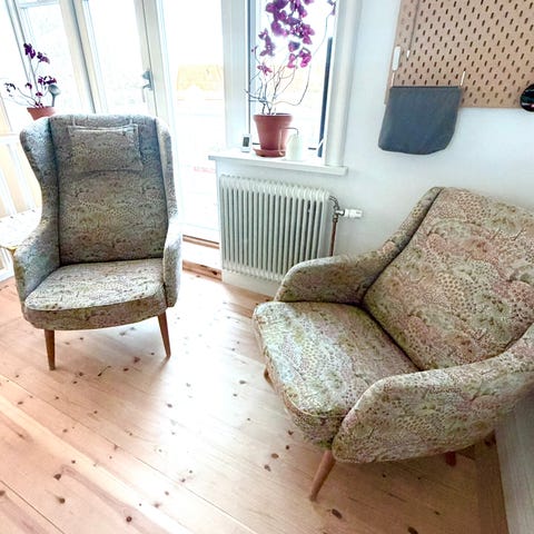Den ena stolen har några mindre men tydliga fläckar. Se bild 3 i framkant. Har ej provat att tvätta eller ta bort.