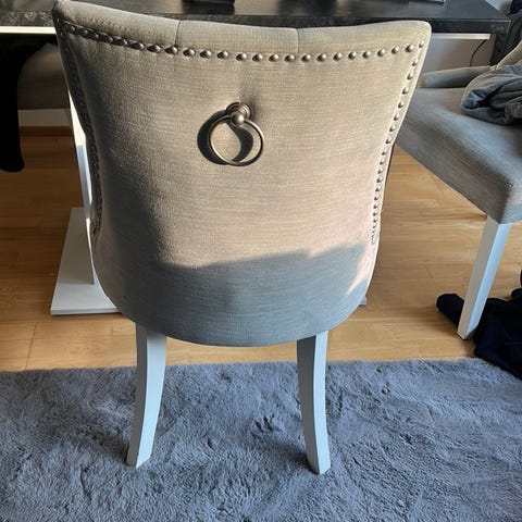 6 stycken helt nya Bella matstol med ram i metall och ekdetaljer. Stolen har en sandfärgad klädd sits och är stapelbar. Mått: bredd 52 cm, ryggstödets höjd 24 cm, sitsbredd 44,5 cm, sitsdjup 41,5 cm, sitshöjd 43 cm, benens höjd 43 cm och avstånd mellan benen 44,5 cm. Max belastning är 120 kg. Vikt 4,7 kg.