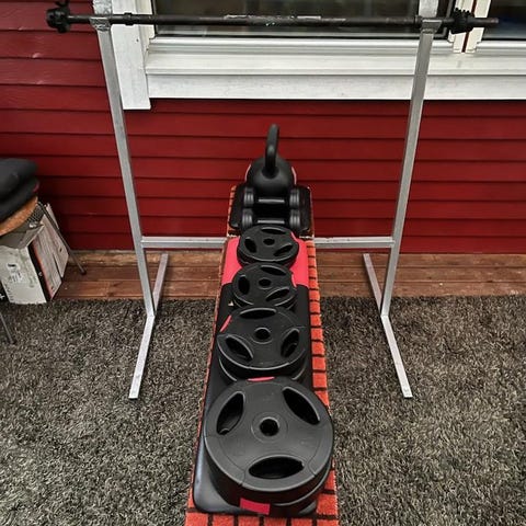 Bänkpress set inklusive bänk, skivstång och vikter. Utrustningen är avsedd för styrketräning och kan användas för olika övningar som bänkpress och lyft. Material och exakta mått är ej angivna.