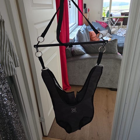 Bekväm och säker Hoppgunga. Hög rygg och dragkedja för högsta komfort. Monteras på stabil dörrkarm. Avsedd för barn upp till ca 12 kg.
