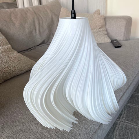 Lampa i vitt PLA med en vågig och rundad form. Passar som taklampa och ger ett mjukt ljus genom sin design. Tillverkad i ett lätt material med en struktur som skapar ett dekorativt mönster när lampan är tänd.