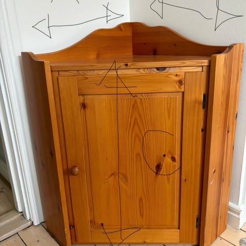 Ett rustikt hörnskåp med djupa,stabila hyllor.
