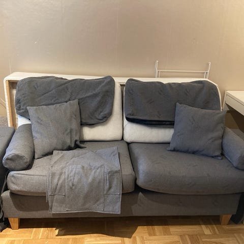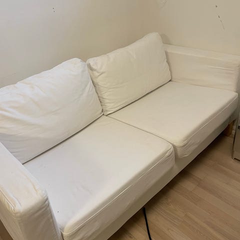 Skänker bort en vit tvåsittsoffa på grund av flytt. Bekväm och tar lite plats. Överdraget är avtagbart och går att tvätta.