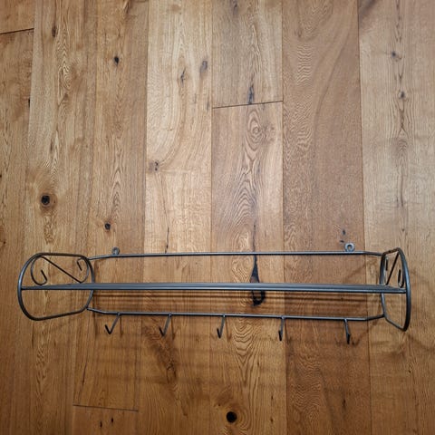 Vit hatthylla Branäs Mio med 4 krokar och metallstång för galgar. Nypris 699 kr.