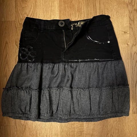 Ellos kjol i svart denim, storlek 36. Tillverkad i denimmaterial, anpassad för kvinnor.