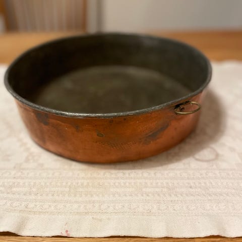 Sockerkaksform av koppar med ögla för upphängning.