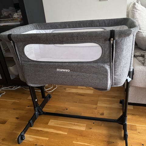 Moweo Sänghimmel Bedside crib i grå färg. Sängen är designad för att placeras intill föräldrasängen och har en stabil ram med nätpaneler för ventilation och insyn. Materialet är mjukt och anpassat för barns komfort och säkerhet.